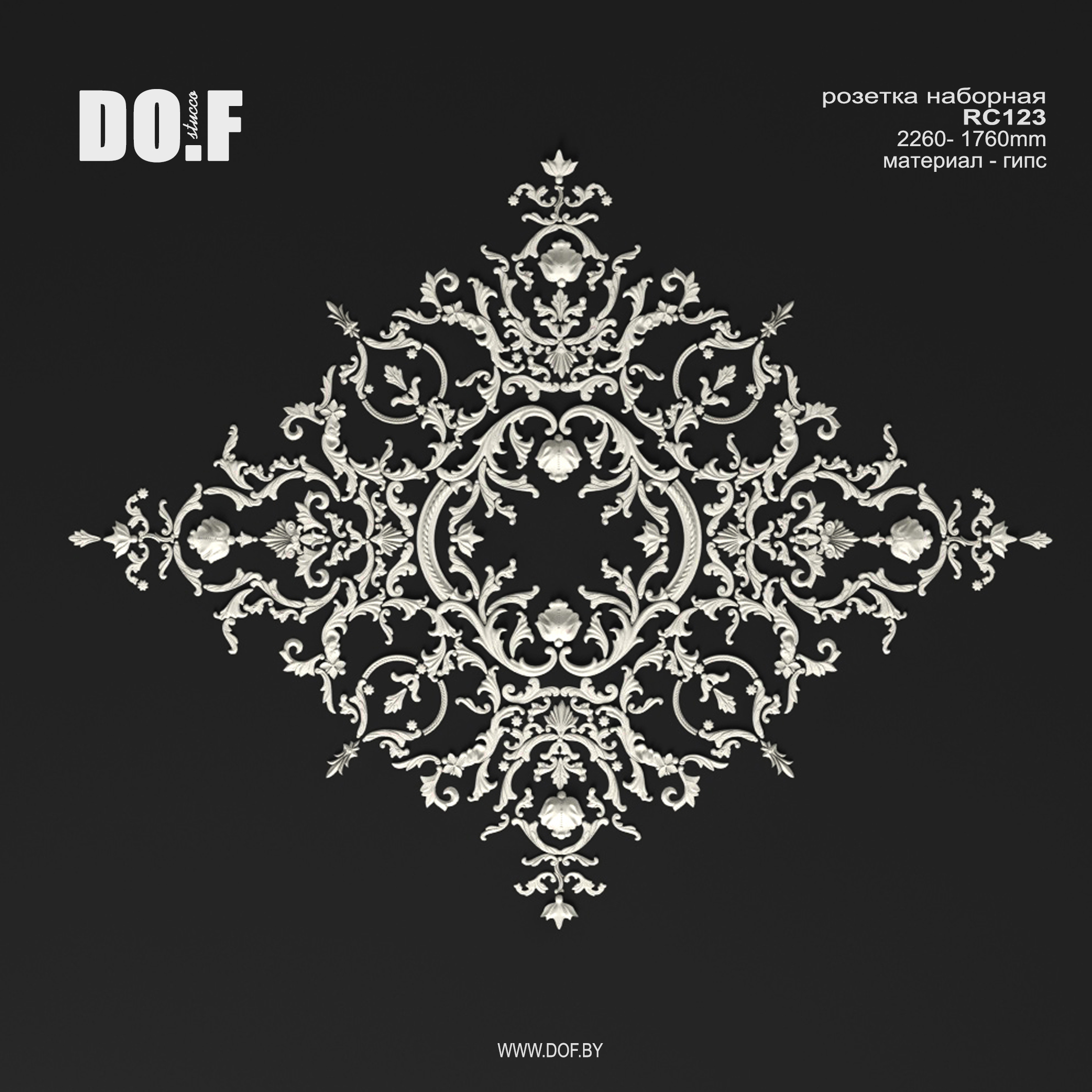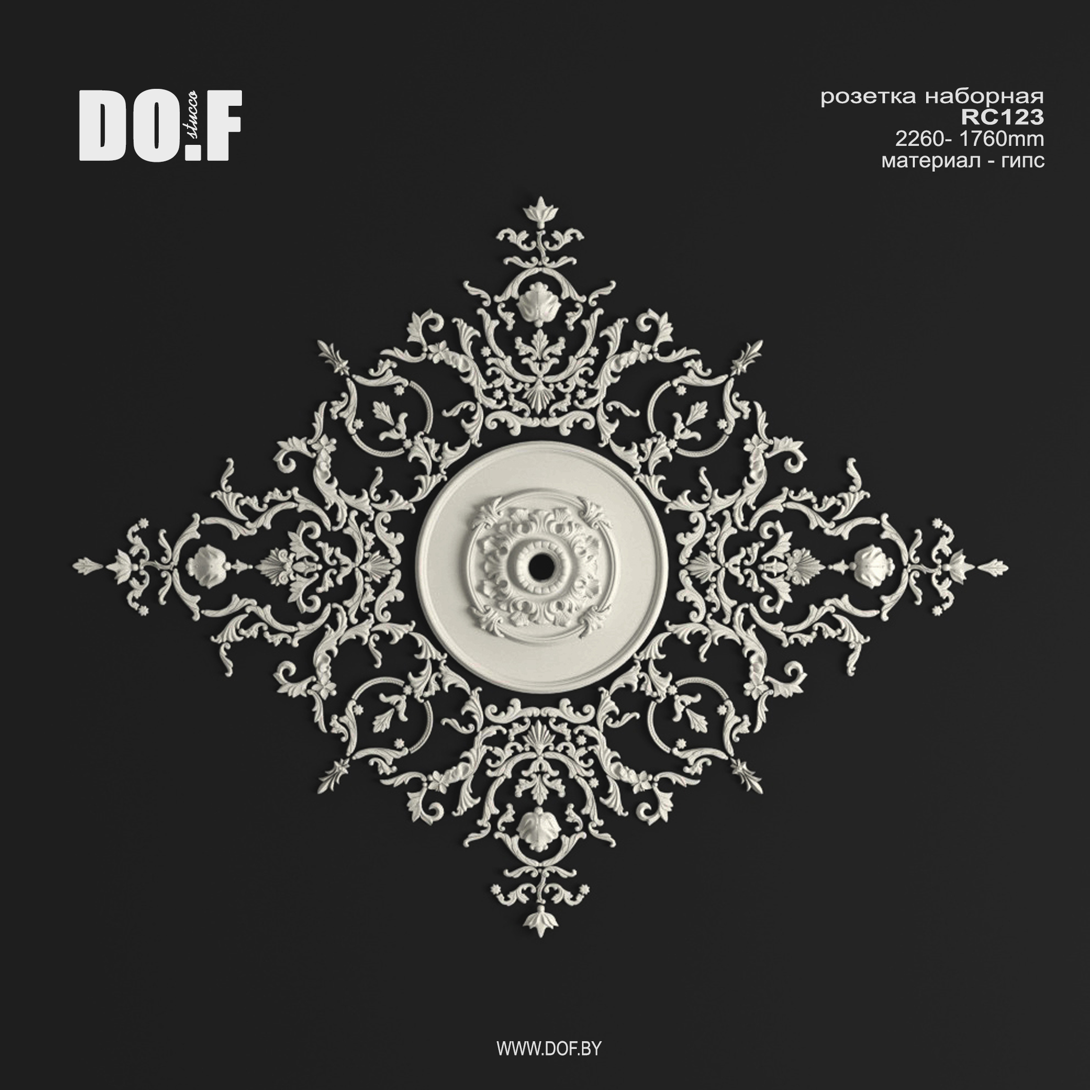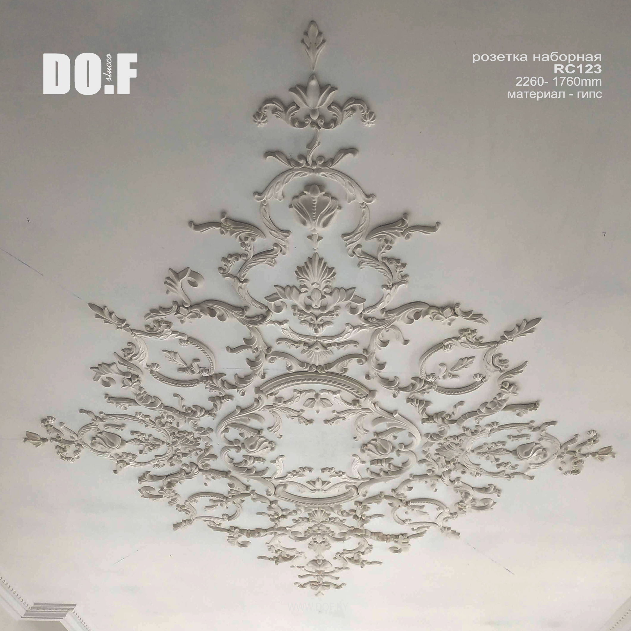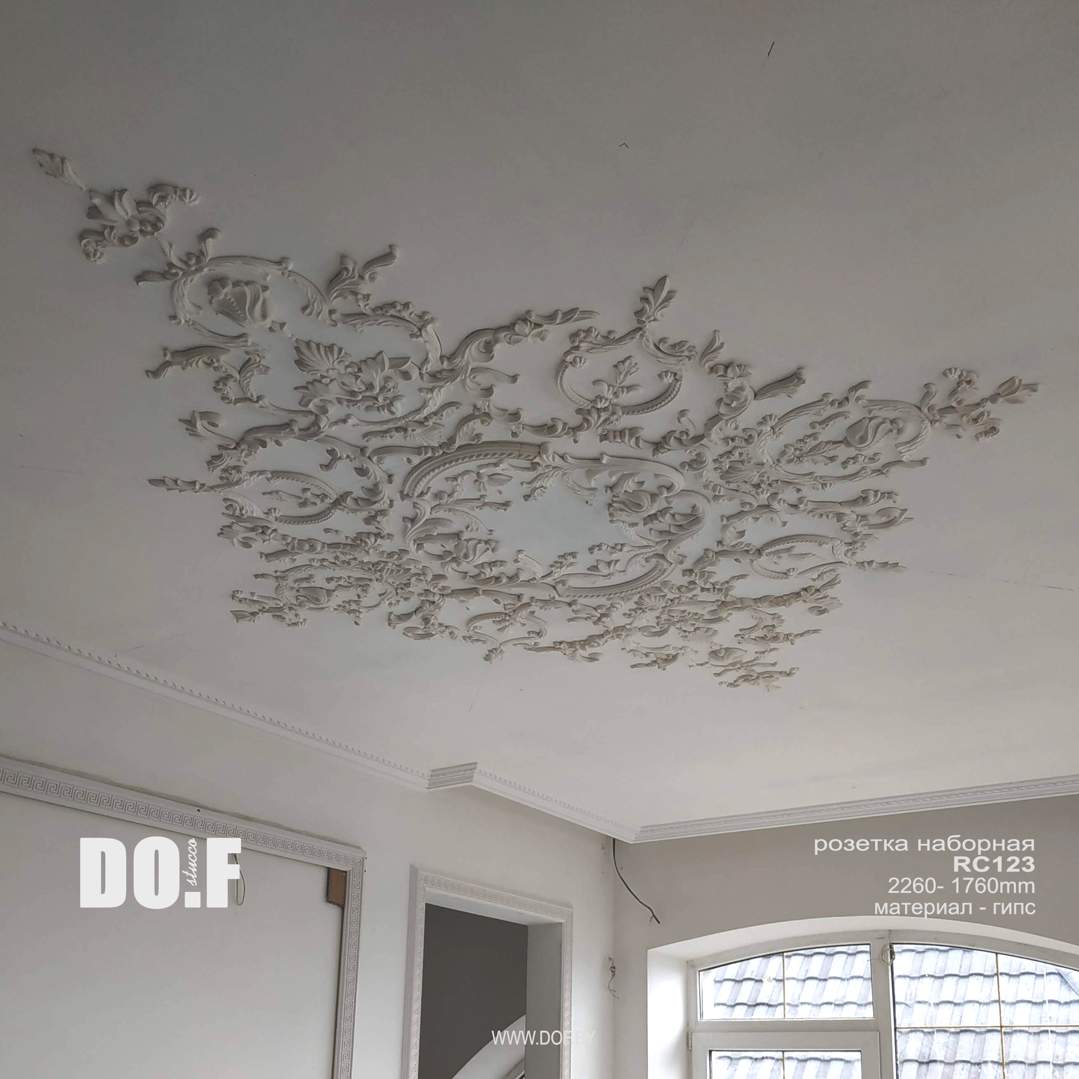 Наборная розетка, панно состоит из отдельных гипсовых элементов декора и собирается (клеится на оштукатуреную поверхность) непосредственно на потолке или стене.